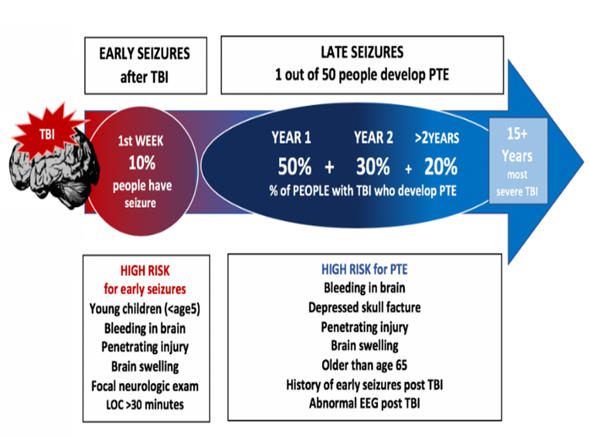 Did you know that in 1 out of every 2 people, post-traumatic epilepsy (PTE) occurs within one year of their brain injury? The more severe the head injury, the longer a person is at risk for developing epilepsy. Risk for PTE developing decreases substantially with time, but can extend out to 15 years after the original traumatic injury for people with the most severe brain injuries.